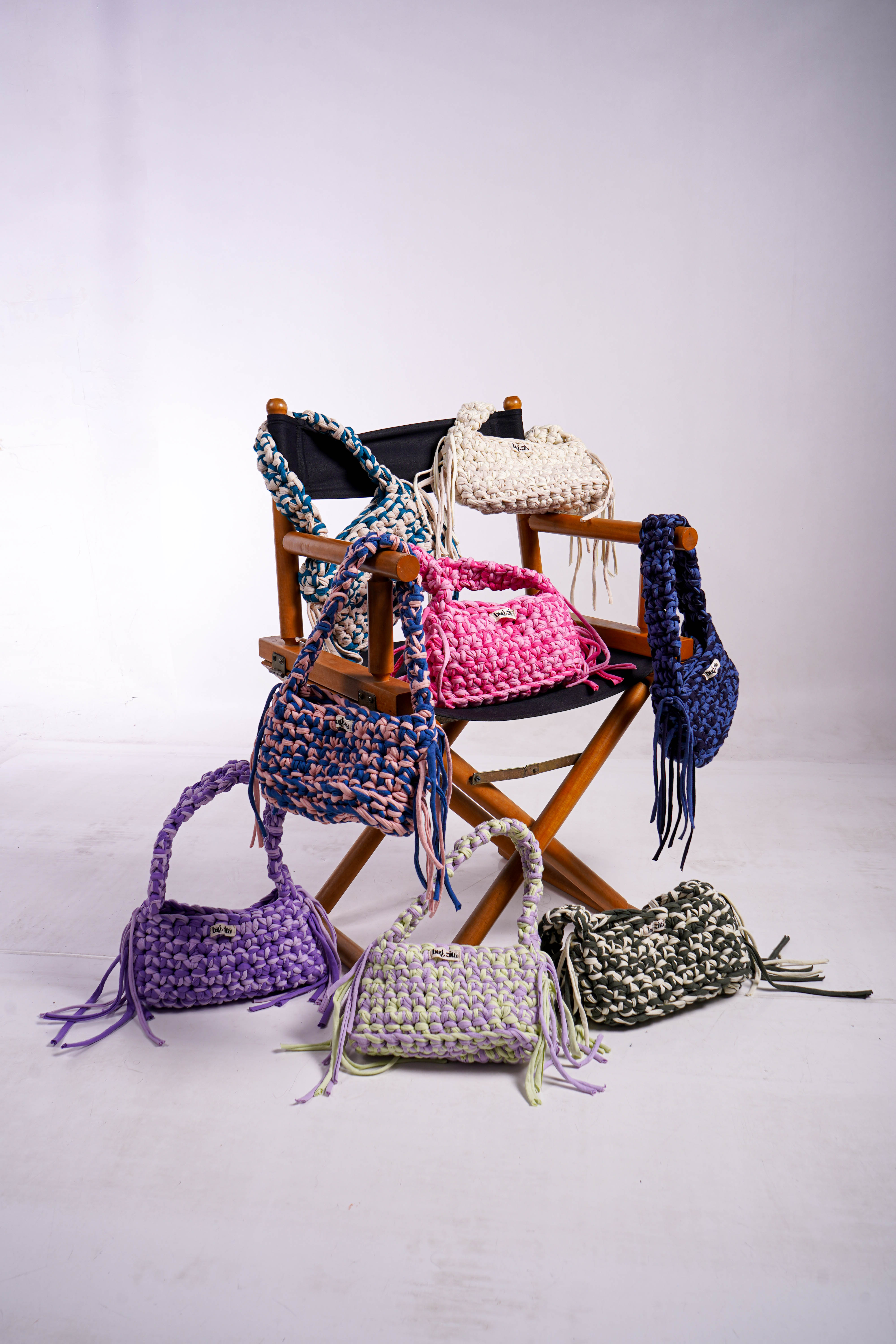 Feitas à mão em crochê com fio de malha sustentável reaproveitado da indústria têxtil.